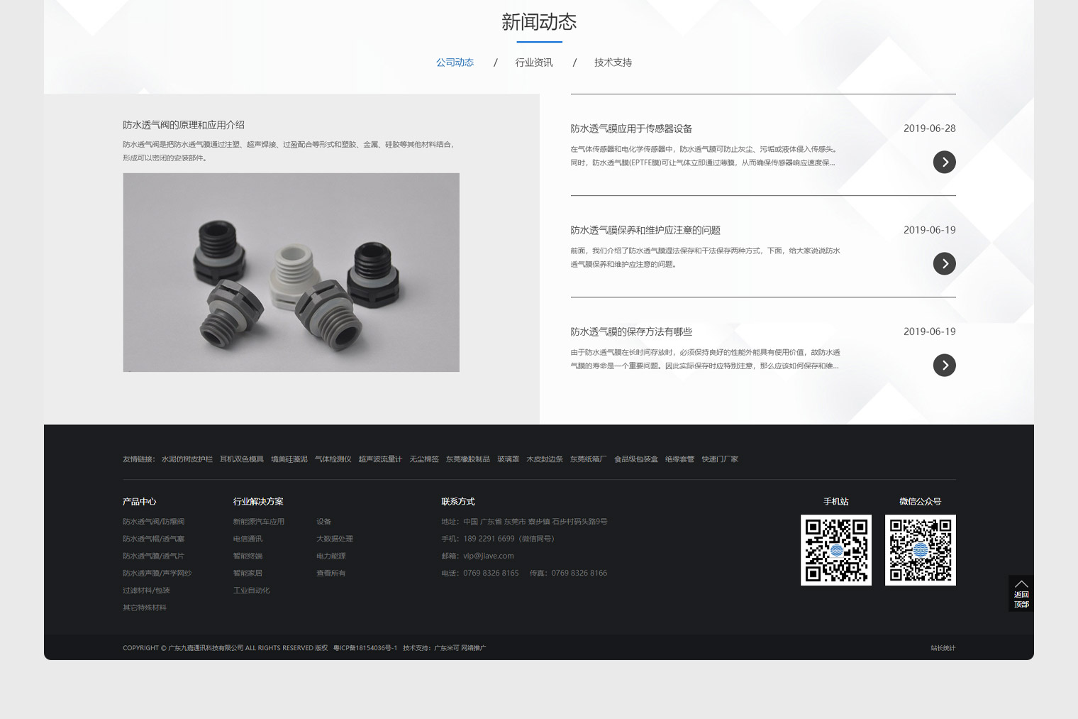 成立于2010年4月,是一家集研發、生產、銷售及服務為一體的科技型公司,旗下有:九嘉電子實業(香港)有限公司、深圳市九嘉通科技有限公司、博深高分子材料研制中心。 公司引進國外先進技術,專注于防水防塵透聲(聲學)網、防水透聲膜、防水透氣透聲膜、防水透氣膜、防塵過濾通氣閥、防水透氣閥、防爆泄壓閥等開發應用,公司以雄厚的實力,擁有自己技術開發團隊,各種精良的生產設備和檢測系統,以保證產品質量,精益求精。