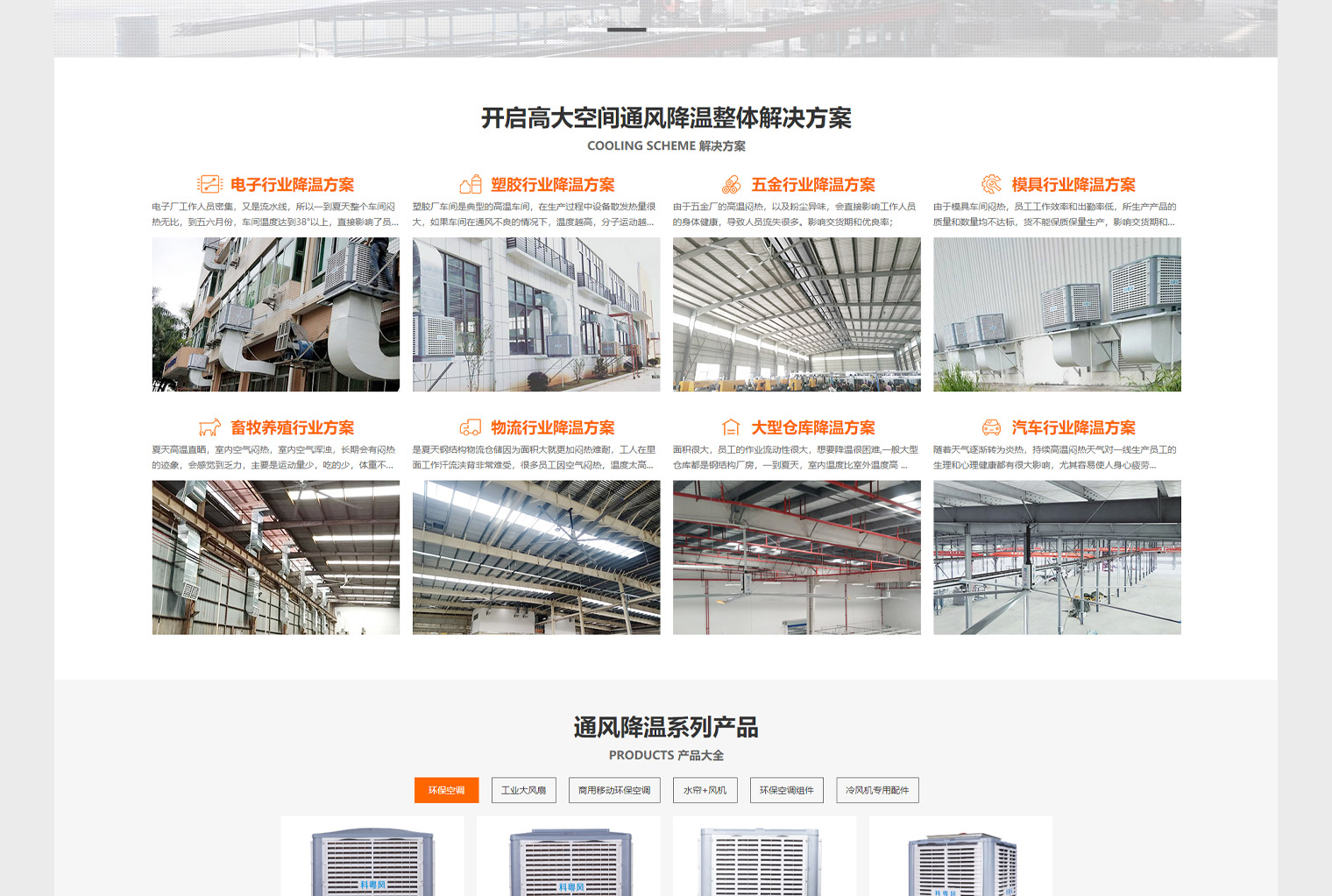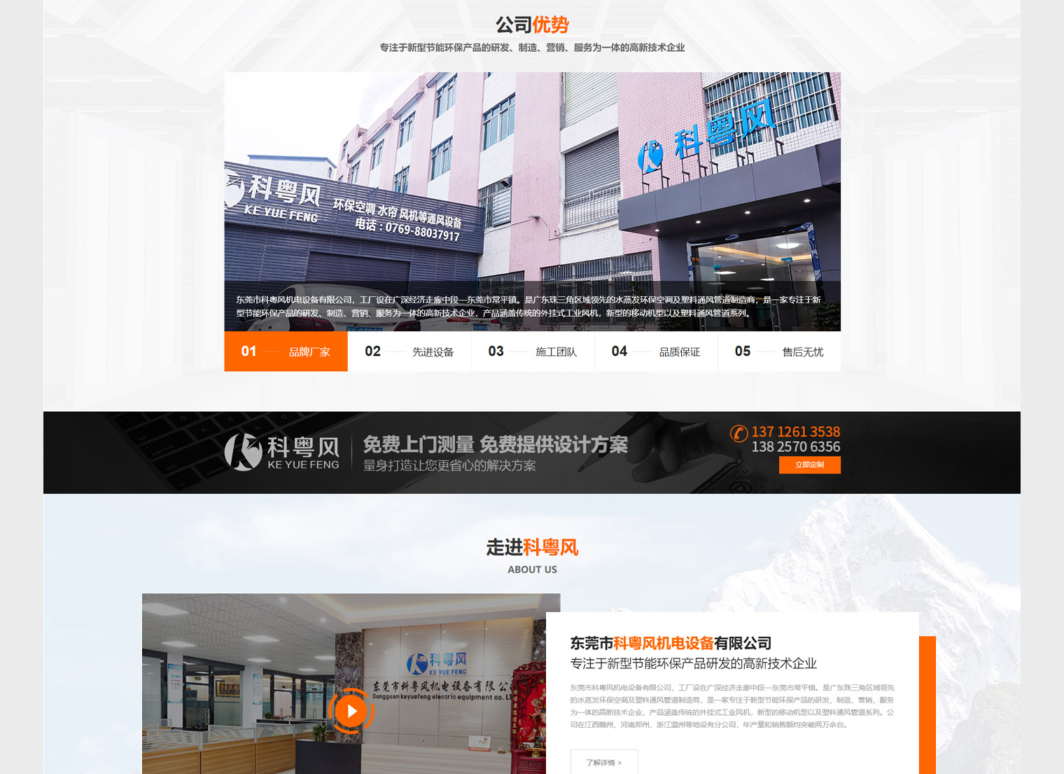 東莞市科粵風機電設備有限公司專注于新型節能環保產品的研發、制造、營銷、服務為一體的高新技術企業,產品包括工業大風扇,環保空調,風機水簾。客戶想接工程單,不想單賣產品,原有的網站適用不了現有的業務方向,我們結合客戶的推廣方向為其量身定制了品牌和營銷兩個網站,保障接大單的同時宣傳企業品牌形象。